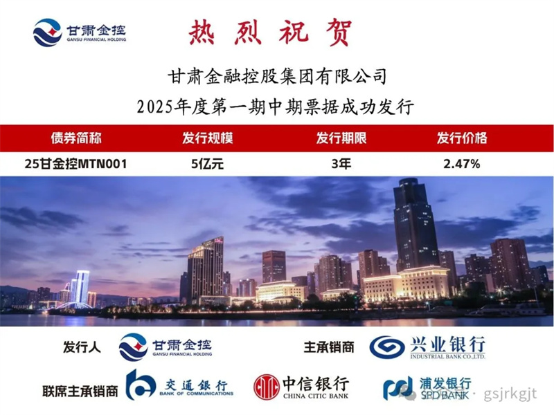 2025年6月10日,甘肅金控集團(tuán)成功發(fā)行2025年度第一期中期票據(jù)“25甘金控MTN001”,規(guī)模5億元,期限3年,票面利率2.47%,全場(chǎng)倍數(shù)2.72倍,體現(xiàn)出市場(chǎng)對(duì)集團(tuán)穩(wěn)健經(jīng)營(yíng)和良好償債能力的信心。