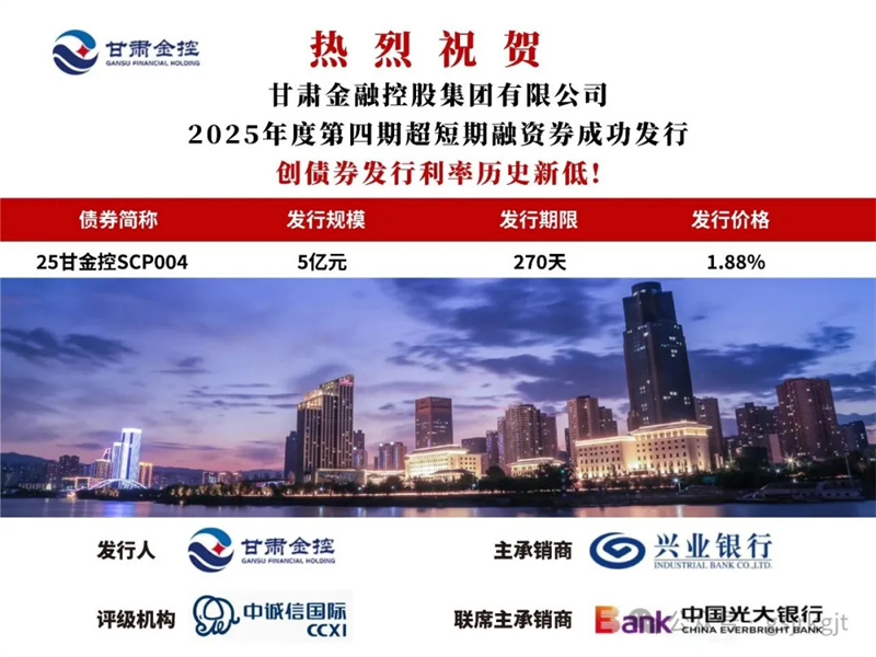 2025年6月26日,甘肅金控集團成功發(fā)行2025年度第四期超短期融資券“25甘金控SCP004”,規(guī)模5億元,期限270日,票面利率1.88%,創(chuàng)集團債券發(fā)行利率歷史新低,有助于集團降低融資成本。