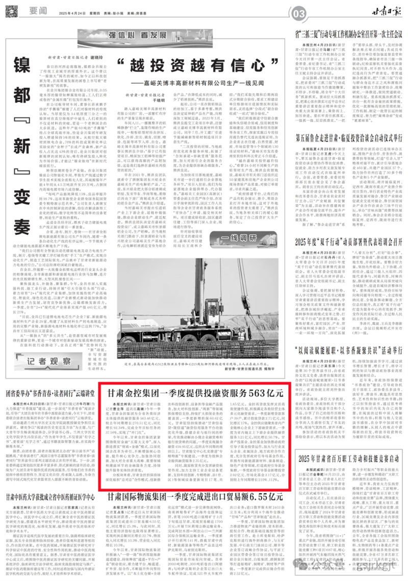 媒體關(guān)注 | 甘肅金控集團(tuán)一季度提供投融資服務(wù)563億元