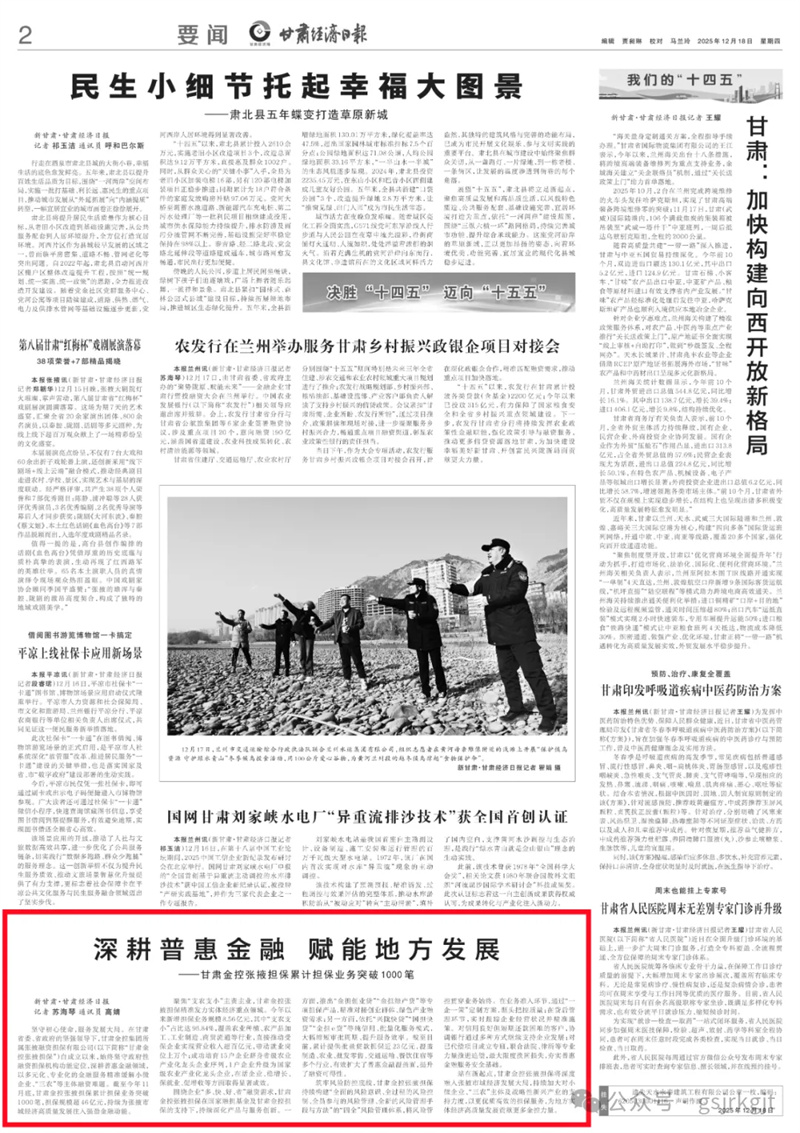 (新甘肅·甘肅經(jīng)濟(jì)日?qǐng)?bào)記者 蘇海琴 通訊員 高婧)堅(jiān)守初心使命,服務(wù)發(fā)展大局。在甘肅省委、省政府的堅(jiān)強(qiáng)領(lǐng)導(dǎo)下,甘肅金控集團(tuán)所屬金控張掖融資擔(dān)保有限公司(以下簡(jiǎn)稱“甘肅金控張掖擔(dān)?!保┳猿闪⒁詠?lái),始終堅(jiān)守政府性融資擔(dān)保機(jī)構(gòu)功能定位,深耕普惠金融領(lǐng)域,以多元化、專業(yè)化的金融服務(wù)精準(zhǔn)緩解小微企業(yè)、“三農(nóng)”等主體融資難題。截至今年11月底,甘肅金控張掖擔(dān)保累計(jì)擔(dān)保業(yè)務(wù)突破1000筆,擔(dān)保規(guī)模超46億元,持續(xù)為張掖市域經(jīng)濟(jì)高質(zhì)量發(fā)展注入強(qiáng)勁金融動(dòng)能。